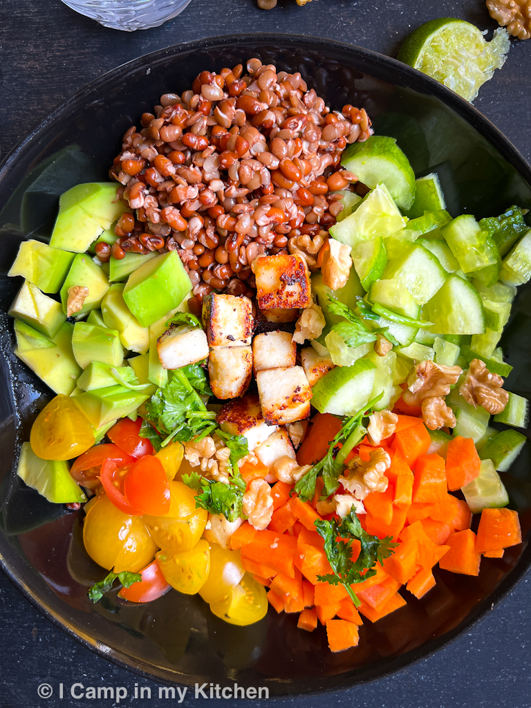 - Vegetables : I have used a mix of cucumber, carrot, avocado and cherry tomatoes in this colorful lentil and vegetable salad.