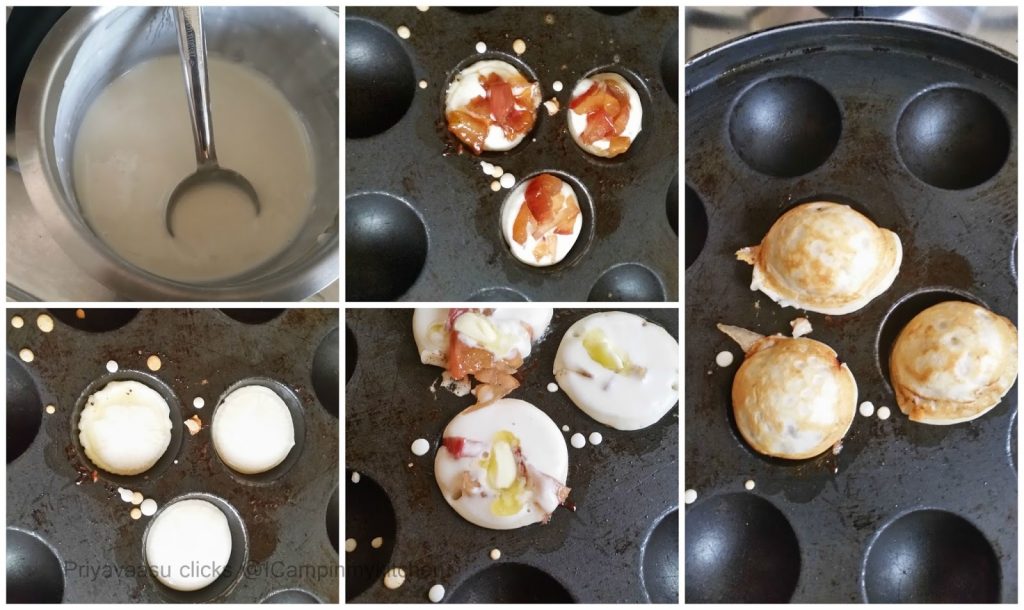 Heat the ableksiver/paniyaram pan, dot the holes with butter, fill half the hole with batter first, add a teaspoon of apple filling in each of them. Fill the hole with some more batter.