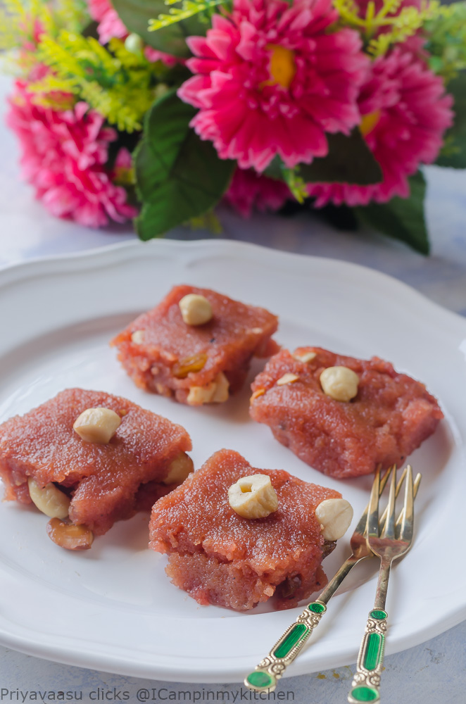 I would never have thought to add beetroot to rava and make this pudding, I love the colour the beets have given this dish.