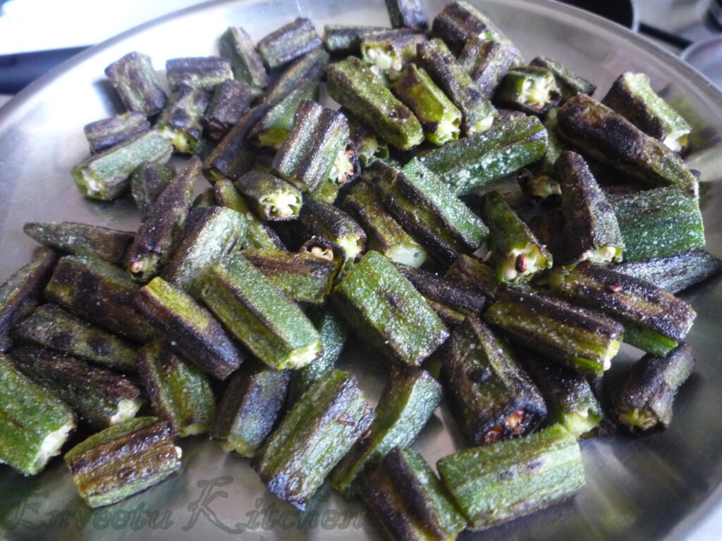 - Heat a 2 teaspoon of oil in a Non-Stick pan, add the cut bhindi's/Okra's, sprinkle little salt and Cook them in a slow flame until they are done. It takes about 10-15 for them to get cooked. Toss them frequently or else they might get burnt. Once done, remove them on a Kitchen Towel.