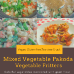 Vegetable pakoda, also called pakore, a crispy, deep fried snack of colorful vegetables, mixed with gram flour and spices. A perfect tea-time snack.