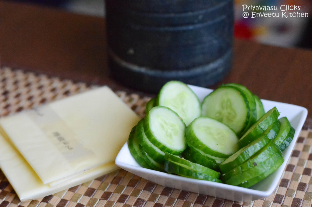 - Take a Slice of Brown Bread, place a slice of cheese and 4-5 slices of Cucumber on top, sprinkle little Black pepper powder, Close it with another slice of bread.