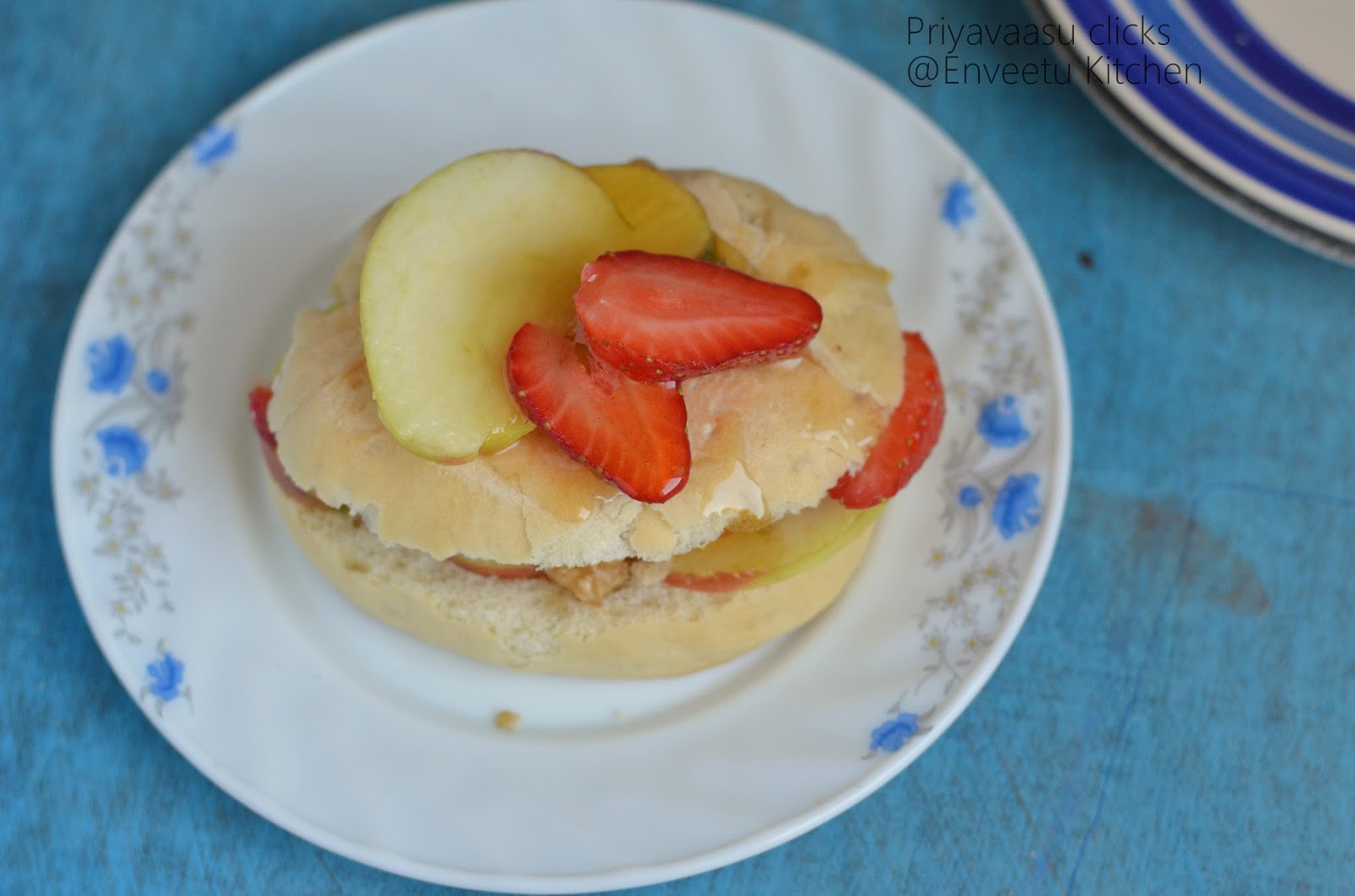 I have been making this sandwich for quite a sometime now, i remember seeing the recipe in one of the Friday Magazine but forgot when. The stuffing can be mixed and matched according to the seasonal produce available. Recently hubby dear bought few boxes of strawberries from the market. Yes, few boxes whenever he finds something fresh, he literally hoards it. Now, this being a fruit it is fine, think about Raw banana's, sweet potatoes, huhh!!!