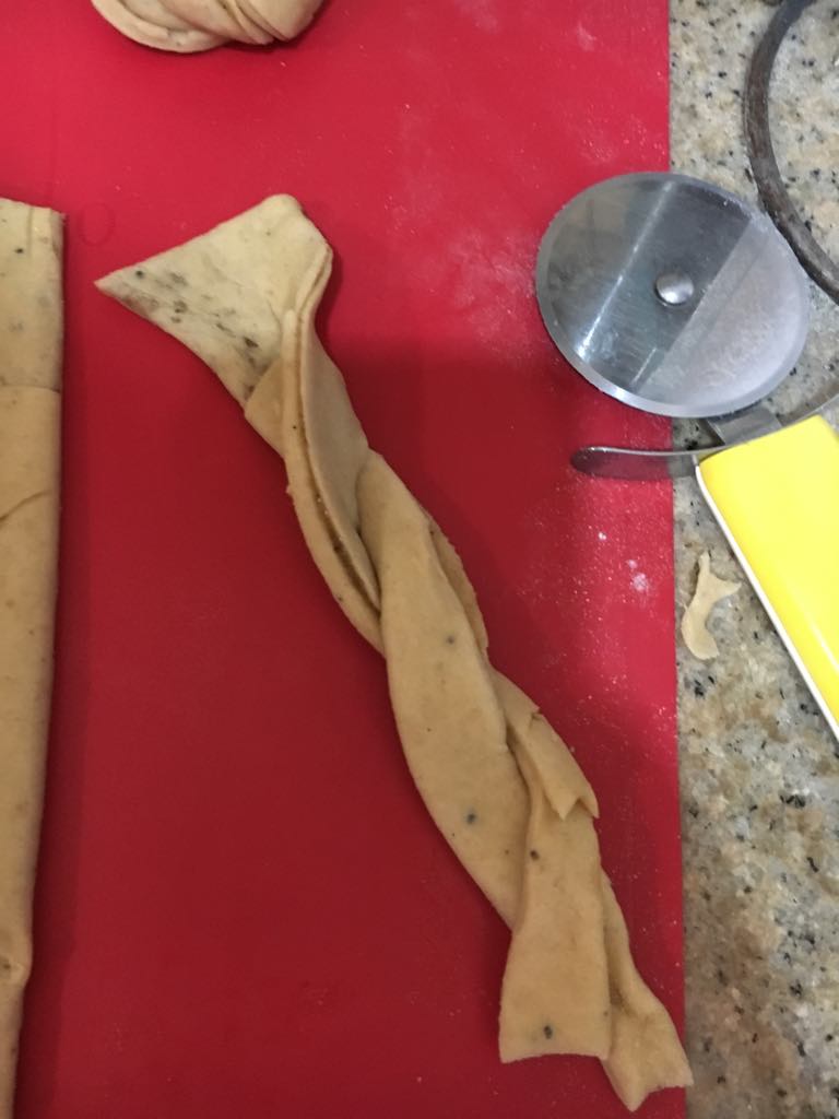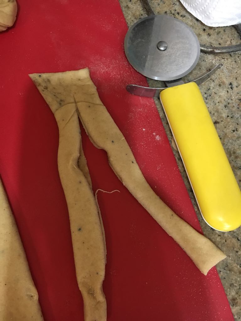- Spread the filling on to the rolled out dough. fold the dough into half. cut the dough itno 8-10 strips.
