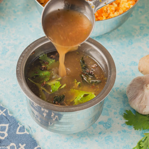 - Garnish the rasam with fresh coriander leaves and serve it warm with rice.