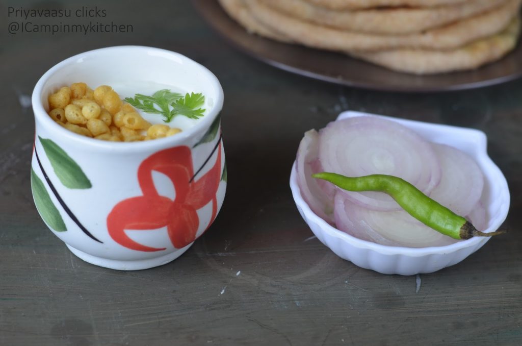 - Remove from the stove, apply ghee generously on both sides and serve hot. The bread can be paired with any spicy curry, but i served it with raita/spiced yogurt sprinkled with boondi/gram flour crisps.