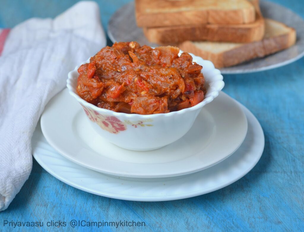The condiment paired so well with toasted bread and for dinner,  we had it with our normal ragi dosa, it was so delicious and none could make it out that it is made of eggplant and peppers!
