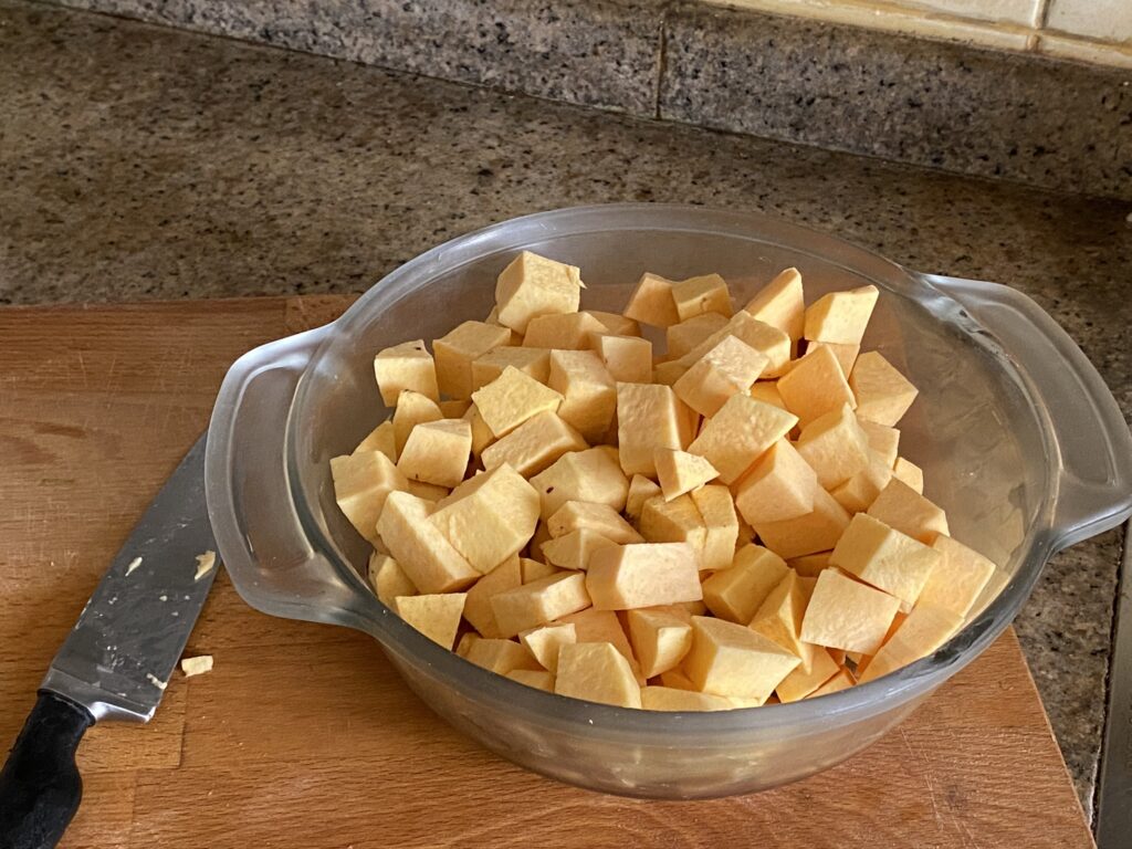 I will be posting a video for this recipe, where i have shown how i chop them. After chopping, i parboil them in the microwave. You can do that on stove-top too. In microwave i cook it in high for 10 minutes exactly. This will make the sweet potatoes fork-tender, still retaining the shape.