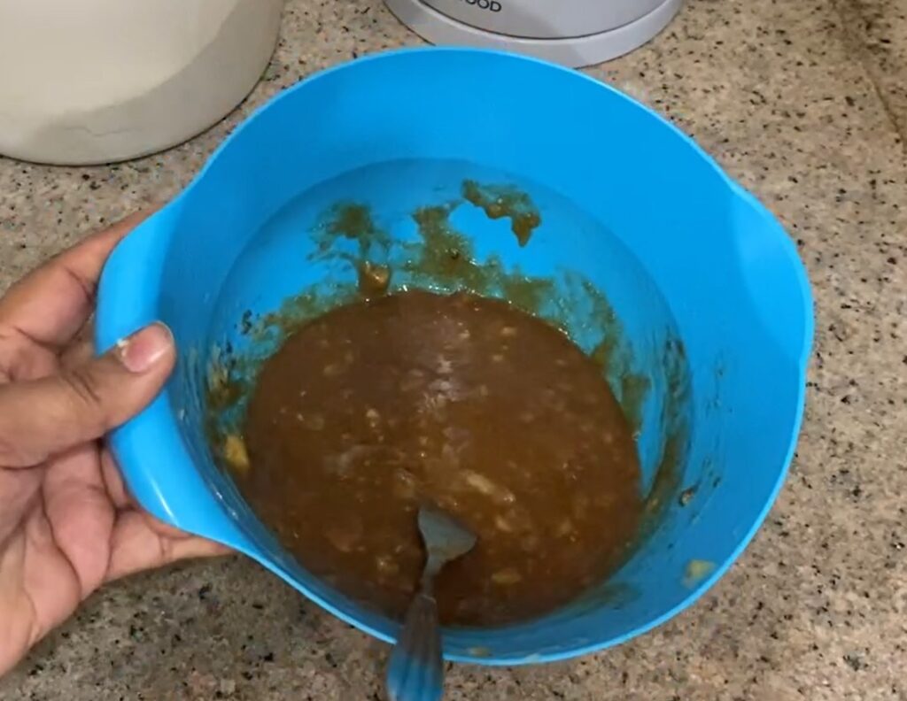 - Add the flour mix to the banana mix in batches. add water and using a spatula combine it to a batter. Take care while mixing, do not mix vigourously. Use gentle folding.