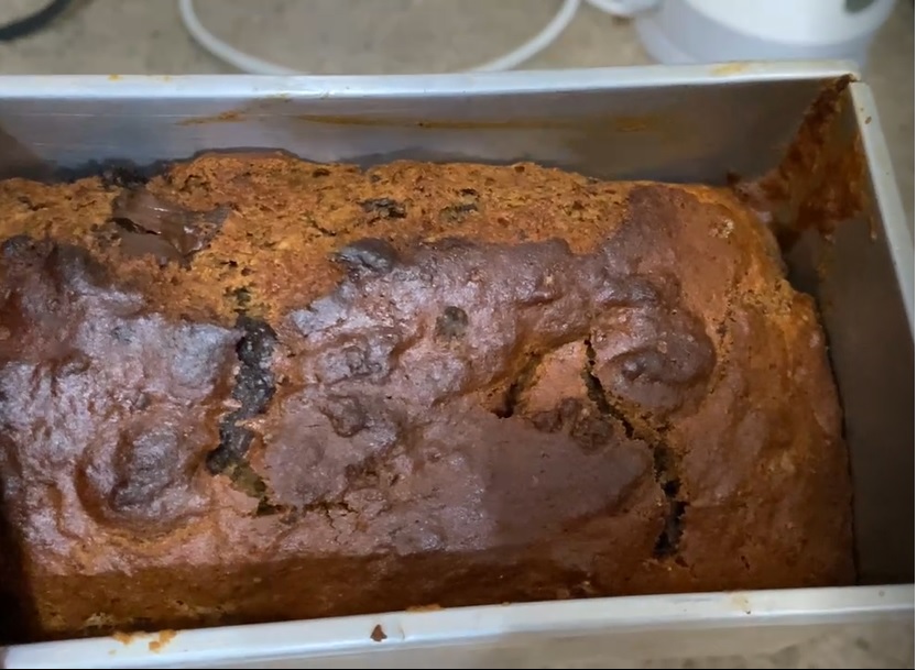- Pour the batter into the prepared loaf pan, bake for 45-50 minutes or until a skewer inserted in the middle comes out clean (check notes)