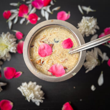 This simple semiya payasam uses sugar as sweetener. I usually add almond meal to my vermicelli payasam, as it makes the kheer rich and creamy.